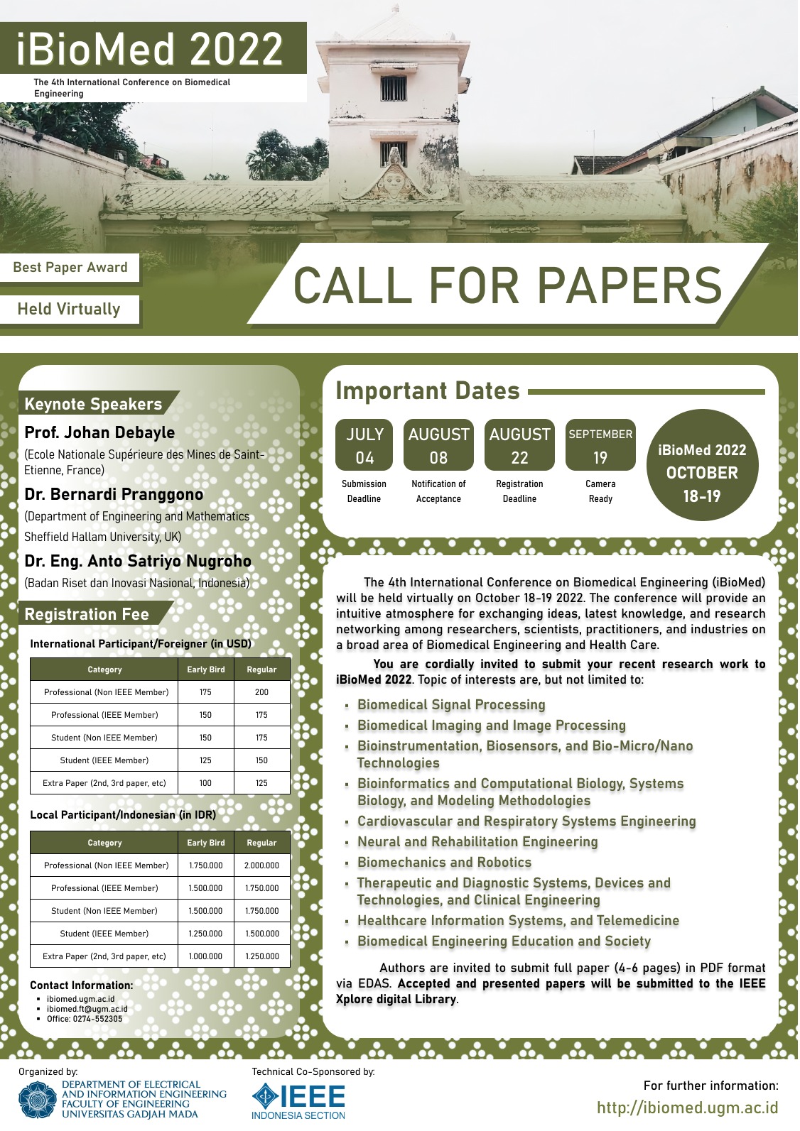 Authors are cordially invited to submit full papers (4 to 6 pages) in PDF format. Please download the template from the conference website and submit the full papers online at http://ibiomed.ugm.ac.id/. Upon acceptance, authors are required to register and present their papers at the conference. The paper that is not presented by the author at the conference will be excluded from distribution in IEEE Xplore® Digital Library. Papers which make outstanding contributions to the relevant topics will be considered for best paper awards.